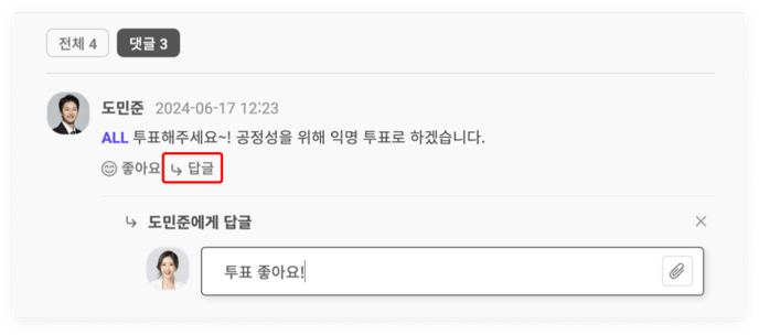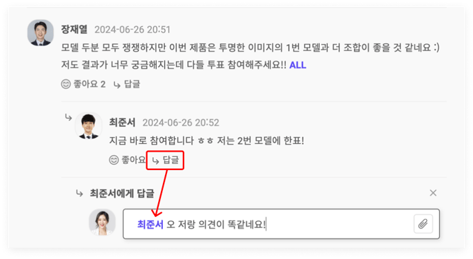 특정 답글에도 답글을 작성할 수 있습니다. 이때는 자동으로 특정 답글을 작성한 사람이 멘션(@이름) 됩니다.
