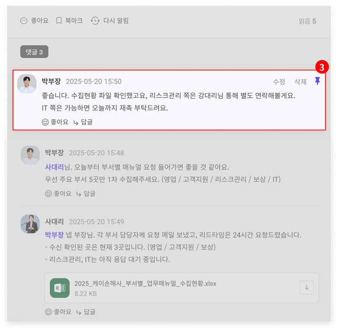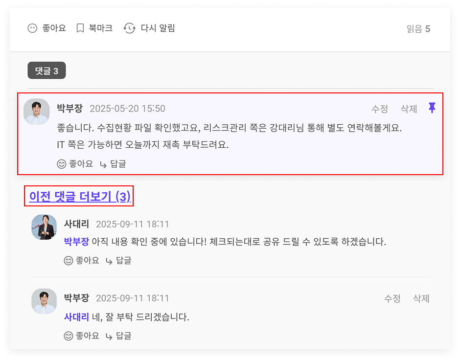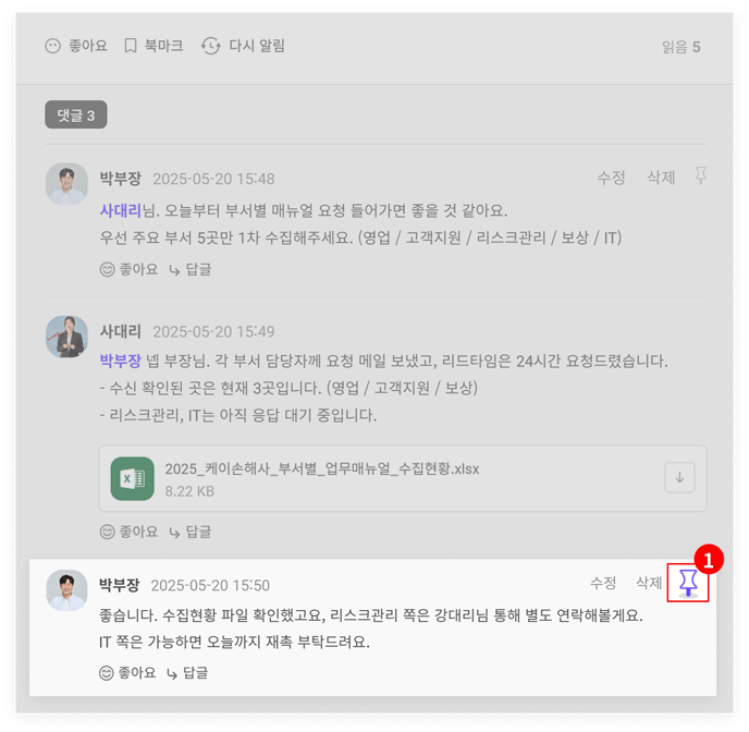 특정 게시물에 등록해 둔 댓글을 상단 고정할 수 있습니다. 게시물과 연관된 추가 정보나 공지 관련 내용 등, 협업 구성원들에게 중요한 내용의 댓글을 공유하고자 할 때 유용하게 사용할 수 있습니다.