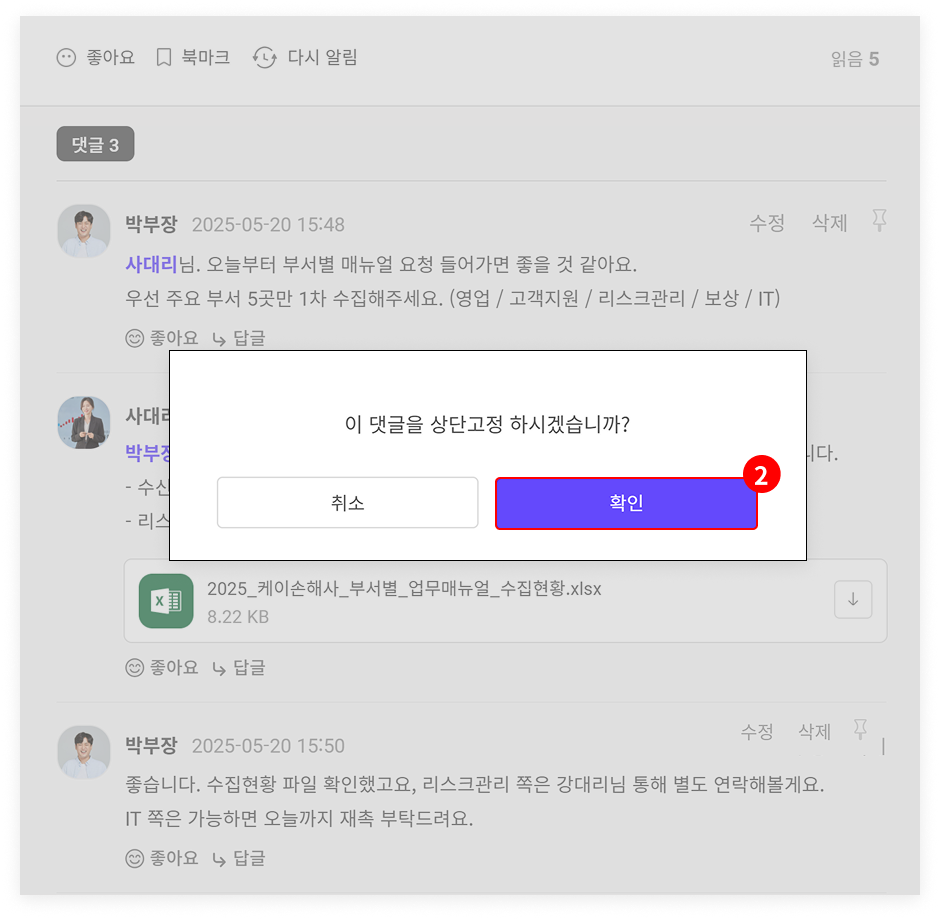 ② 이후 표시되는 댓글 상단 고정 알림창에서 '확인' 버튼을 누릅니다.