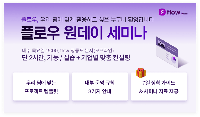 세미나는 매주 목요일 진행되며, 플로우 컨설턴트가 우리 조직의 업무 흐름에 맞는 프로젝트 구조와 운영 방법을 함께 정리해 드립니다. 플로우를 더 빠르게 정착시키고 활용도를 높이는 데 도움을 드립니다.