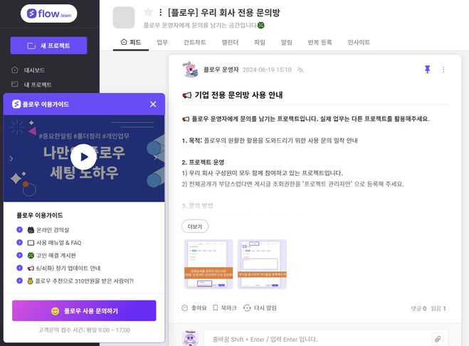 플로우 메인 화면 좌측 하단의 '고객센터 > 플로우 사용 문의하기'를 클릭하면 플로우 운영자와 소통할 수 있는 채널로 즉시 연결됩니다. 사용 방법은 물론 불편한 점, 개선 의견, 도입 문의 등 상담이 필요하다면 언제든 남겨주세요. 플로우 전문가에게 상담을 받아 보실 수 있습니다.