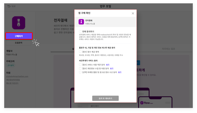 위 절차로 전자결재 화면에 진입한 이후, '구매하기' 버튼을 누르면 '앱 구매 확인창'이 실행됩니다. 서비스 약관 동의를 잘 읽어본 후 절차를 이행합니다.