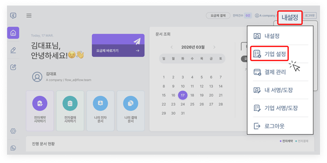 1) 우측 상단에 있는 '내 설정' 부분을 누른 후, '기업 설정' 메뉴를 눌러 해당 페이지로 이동합니다.