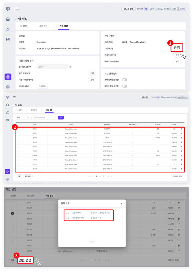 2) 이후 기업 구성원 영역 쪽의 '관리' 버튼을 클릭하면(①), 회사 구성원 명단이 표시됩니다(②). 이 명단은 플로우에 등록된 직원 목록이 연동되어 그대로 표시되는 것이며, 특정 사용자를 선택한 뒤 왼쪽 하단의 '권한 변경'을 누르면(③) 전자결재/전자계약 서비스에 대한 사용 권한을 변경할 수 있습니다.