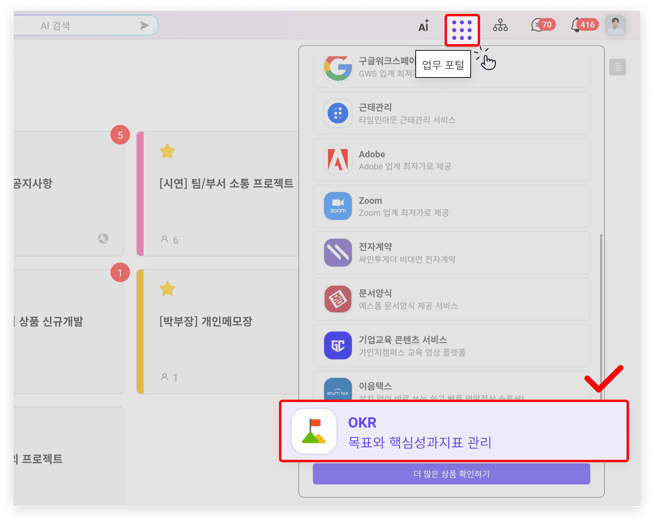 플로우에 로그인 후 메인 화면에 진입한 상태에서, 우측 상단에 보이는 업무포털 버튼을 눌러 OKR 화면으로 입장할 수 있습니다.