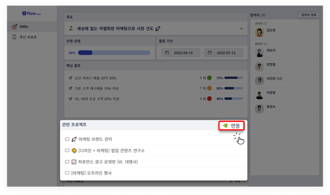 TIP. 우리 회사 플로우에 개설되어 있는 프로젝트 중, OKR 참여자들이 동시에 참여하고 있는 프로젝트에 한해 연동이 가능합니다.