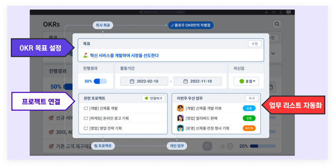 개인-팀-회사의 목표를 한 공간에서 연결하여 확인하고, 주차별 피드백을 통해 업무달성의 질적 성장을 이룰 수 있습니다. 목표와 핵심 결과, 목표달성을 위해 수행하는 업무의 진행 상태까지 한눈에 볼 수 있습니다.