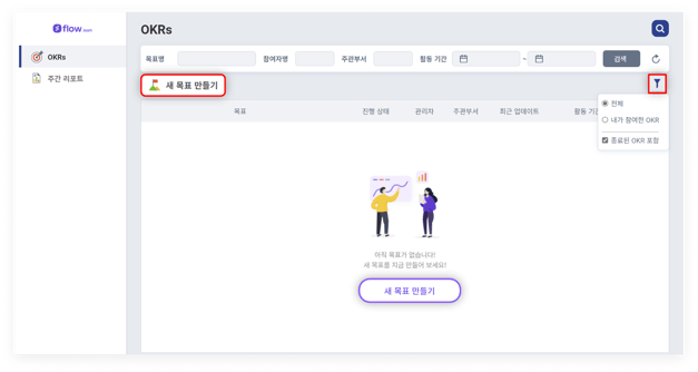 - 새 목표 만들기 : 새 목표를 등록하면 우리 회사 OKRs에 공개됩니다.