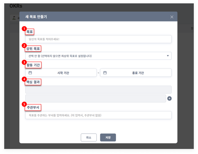 '새 목표 만들기'를 누르면 OKR을 등록할 수 있는 팝업창이 표시됩니다.