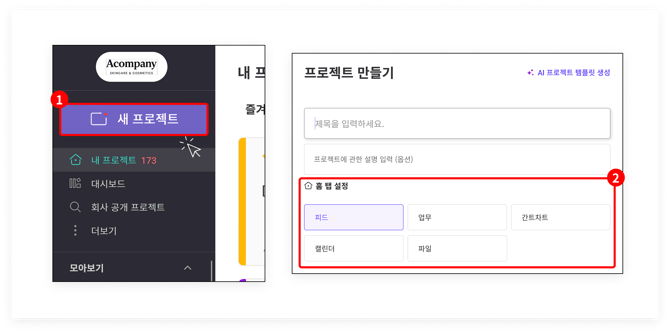 프로젝트에 진입하면 가장 먼저 보이는 '기본 화면'을 설정할 수 있습니다! 피드 화면은 물론 업무와 간트차트, 캘린더, 파일 중 각 프로젝트의 특성에 맞는 탭을 '홈 탭'으로 설정해 보세요 🥳