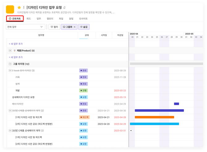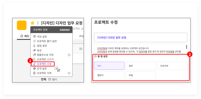- 업무 게시물을 주로 이용하는 프로젝트는 간트차트 또는 업무를 '홈 탭'으로 설정해보세요.