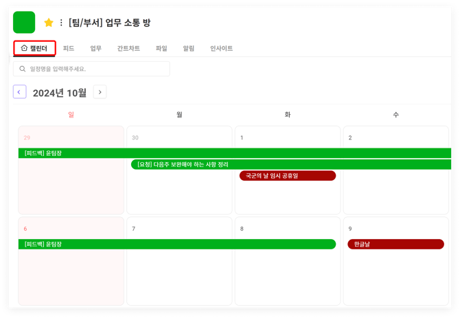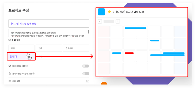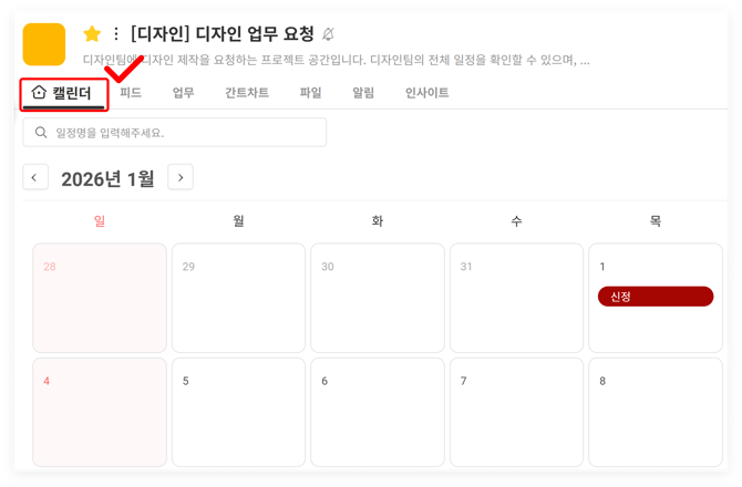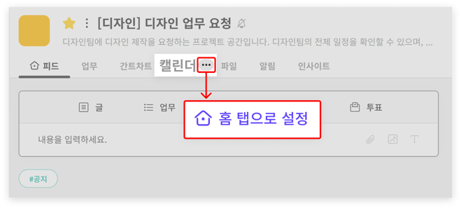 - 일정 게시물을 자주 사용하는 프로젝트는 캘린더를 '홈 탭'으로 설정해보세요.