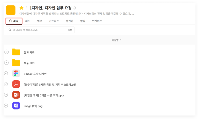 - 사내 또는 팀 내 자료들을 공유하는 프로젝트는 파일을 '홈 탭'으로 설정해보세요.