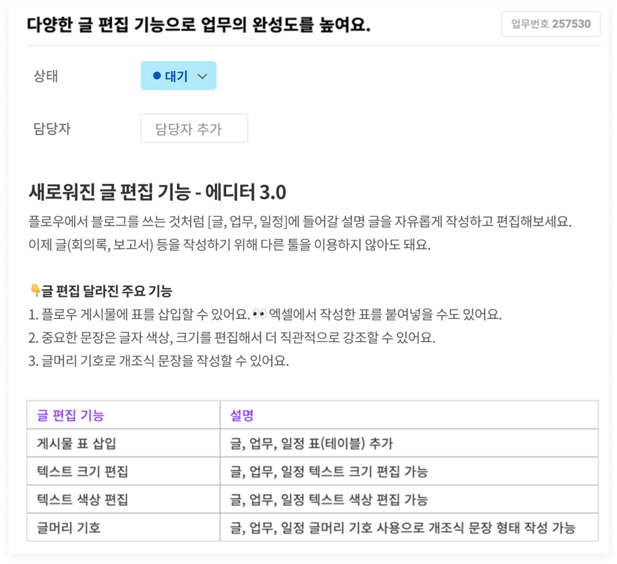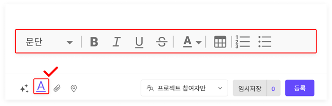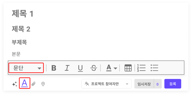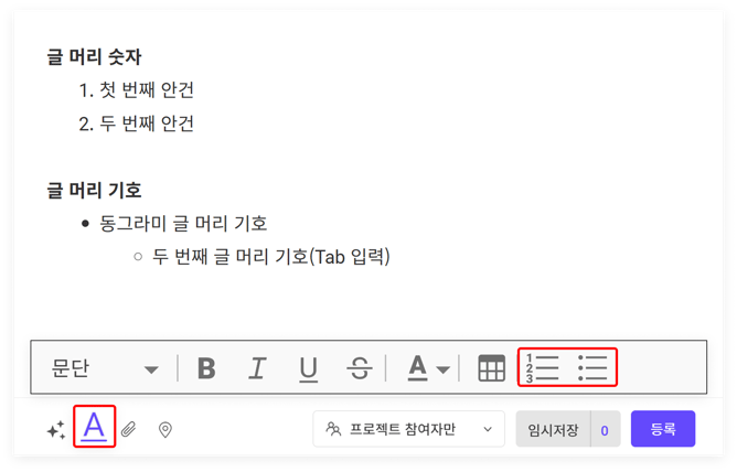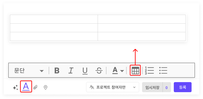 프로젝트 내에서 작성할 수 있는 게시물 내에 '글 편집 기능(에디터 3.0)'이 적용되어 있습니다. 표와 색상 지정 등, 다양한 글 편집 기능을 활용하여 게시물을 작성해 보세요.