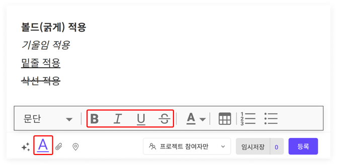 원하는 부분에 서식(볼드, 기울임, 밑줄, 삭선)을 적용할 수 있습니다.