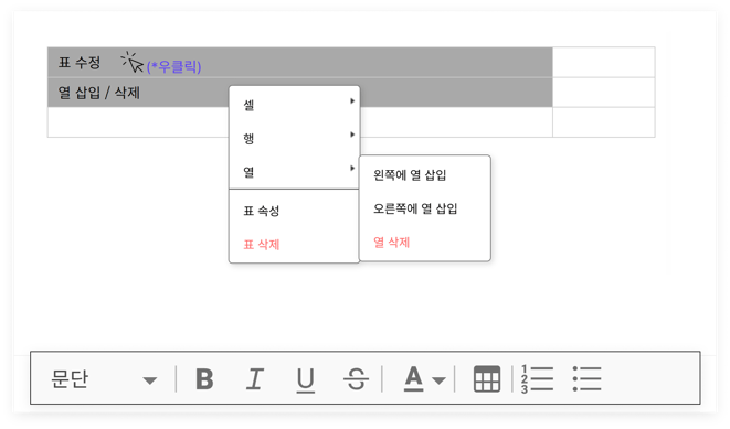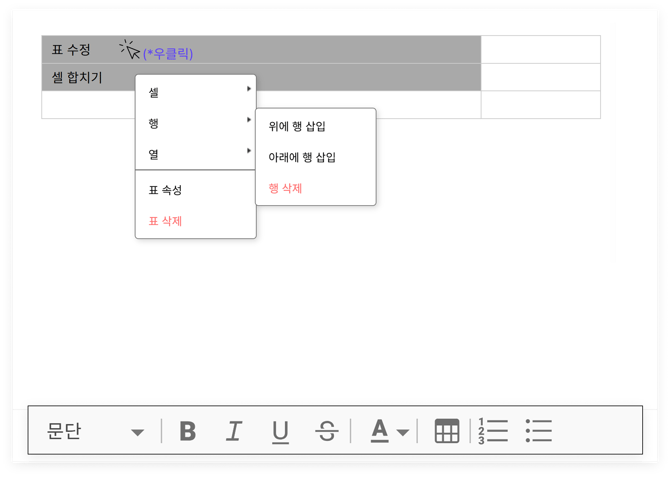 원하는 셀을 드래그 한 뒤 우클릭하여 셀 합치기 / 셀 삭제 / 셀 삽입 등의 수정을 할 수 있습니다.