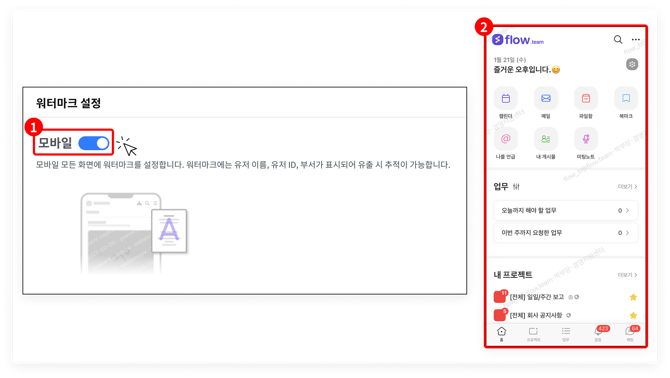 모바일 워터마크 기능을 활성화 할 경우, 우리 회사 임직원이 모바일 플로우 앱으로 로그인했을 때 모든 화면에서 워터마크가 표시되어 외부로 플로우 내 공유된 정보가 유출되는 것을 방지할 수 있습니다.