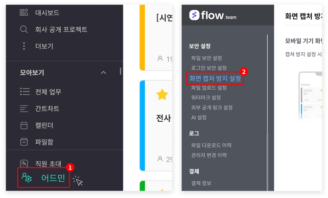 플로우 로그인 후, 좌측 하단의 '어드민'을 선택하여 관리자 페이지로 이동한 뒤 '화면 캡처 방지 설정' 메뉴에 진입합니다.
