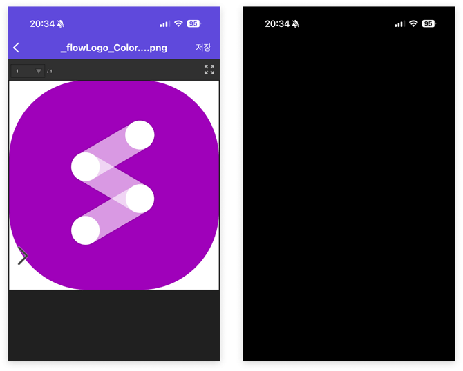 아이폰(iOS) 기기에서 화면 캡처를 시도할 경우, 화면이 까맣게 처리되어 앨범에 저장됩니다. 플로우의 화면은 저장되지 않습니다. 왼쪽이 본래의 화면, 오른쪽이 캡처 시도 시의 화면입니다.