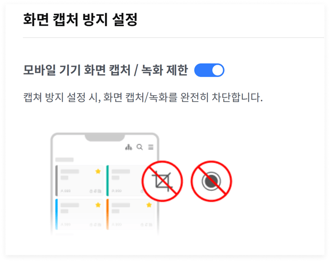 모바일 기기에서의 화면 캡쳐 및 녹화를 차단할 수 있도록 간단히 설정할 수 있습니다. 해당 기능을 활성화하면, 우리 회사 내 임직원들이 모바일 기기에서 캡처 동작을 할 수 없도록 제한됩니다.