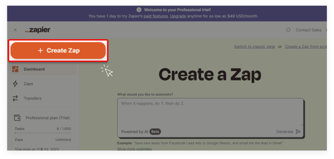 Zapier 좌측 상단의 '+ Create Zap' 버튼을 클릭하여 신규 Zap을 생성합니다.