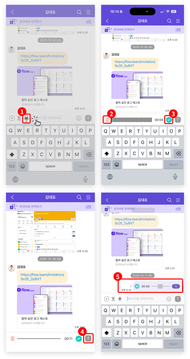 ⑤ 음성 메시지 확인 : 위 절차로 음성 메시지가 발신되면, 채팅창 안에서 바로 확인 및 재생할 수 있습니다.
