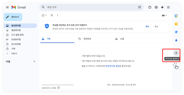 Gmail 화면 우측에 있는 패널 메뉴 중, 플러스(+) 아이콘으로 되어 있는 '부가 기능 설치하기' 메뉴에 진입합니다.