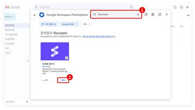 부가 기능 설치하기 화면 내에서 'flow.team'을 검색하면 플로우 서비스가 조회됩니다(①). 여기서 검색된 서비스를 설치합니다(②).