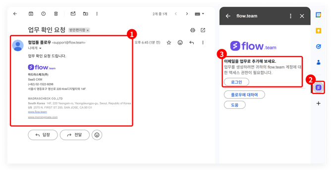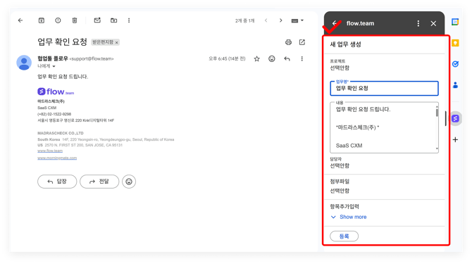 플로우 연동이 완료되면, Gmail 에 수신된 이메일을 바로 플로우의 업무 게시물로 등록할 수 있습니다.