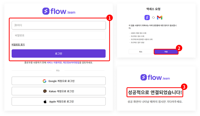 위 절차에서 '로그인' 버튼을 누르면 플로우 로그인 화면이 실행되며(①), 계정과 비밀번호를 입력하고 로그인을 진행 시 '엑세스 요청'이 표시됩니다. 여기서 '확인'을 클릭하면(②) 최종적으로 계정 연결이 완료됩니다(③).