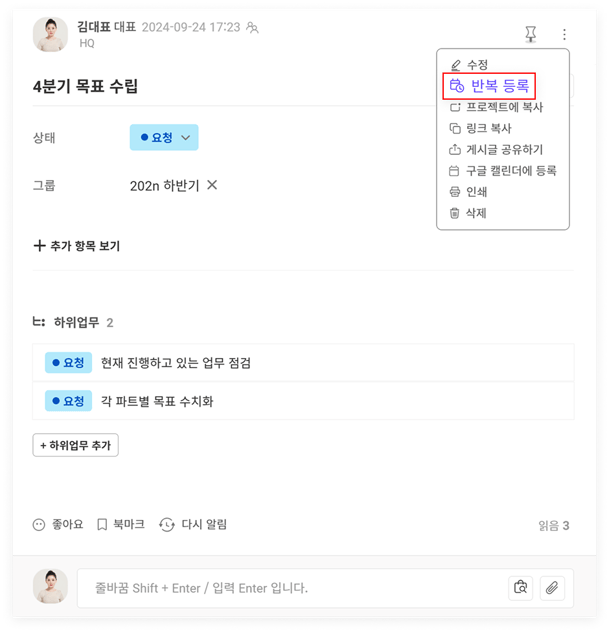 먼저 반복 게시가 필요한 업무 게시글을 등록한 뒤, 게시물 우측 상단의 '더보기 > 반복 등록'을 누릅니다.