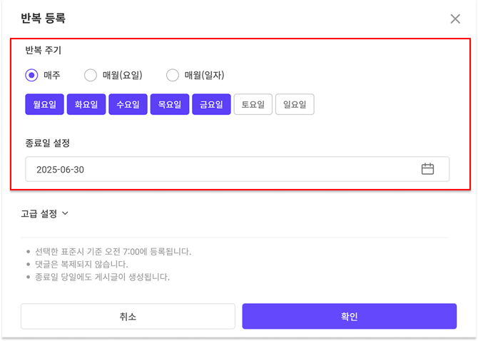 매주(요일) / 매월(요일,일자) 중 원하는 반복 주기와 최종적으로 글이 등록될 종료일을 설정합니다.