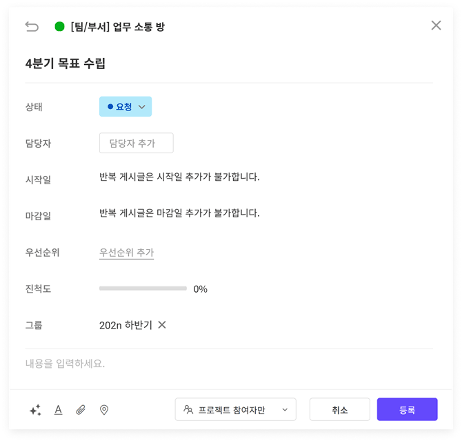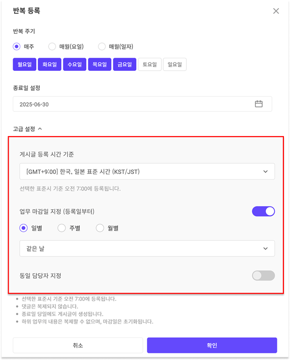 - '업무 마감일 지정'과 '동일 담당자 지정' 설정은 업무 게시글에만 해당되는 메뉴입니다.