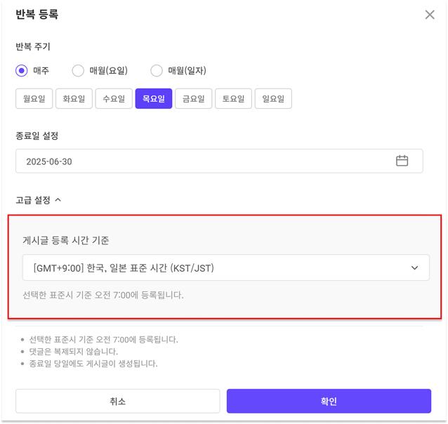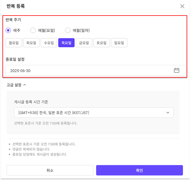 매주(요일) / 매월(요일) / 매월(일자) 중 원하는 반복 주기를 설정하고, 게시글 반복 등록이 유지될 최종 종료일을 설정할 수 있습니다.