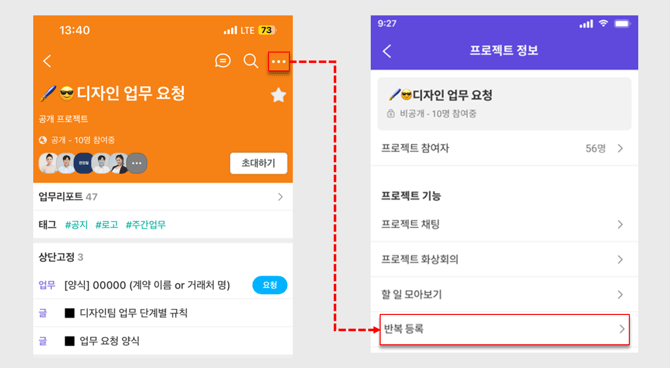 프로젝트에 들어간 후 우측 상단의 더보기 > 반복 등록 메뉴를 통해 반복 등록된 게시글 리스트를 확인할 수 있으며, PC와 동일하게 스케줄 수정 또는 반복을 종료할 수 있습니다.