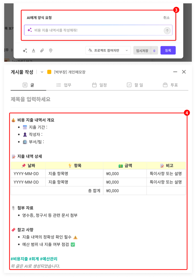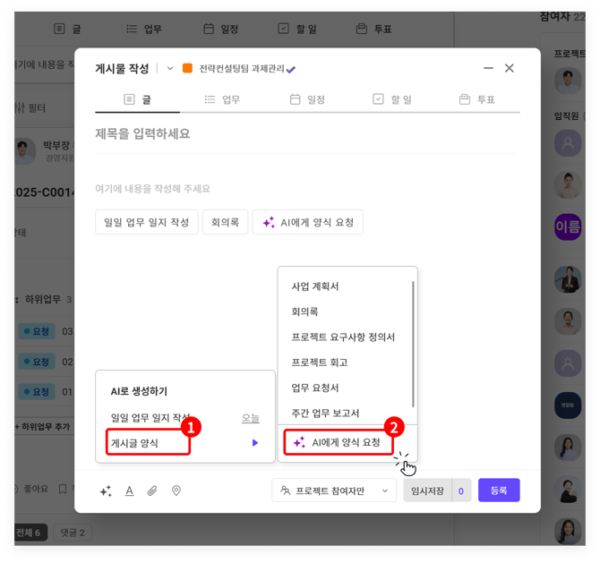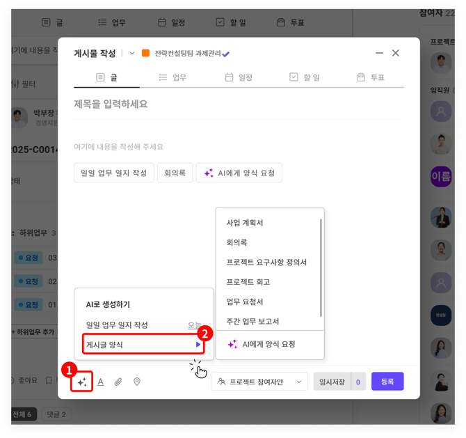 TIP. 게시글 양식 AI 기능은 [글/업무/일정] 게시글에서만 지원됩니다.