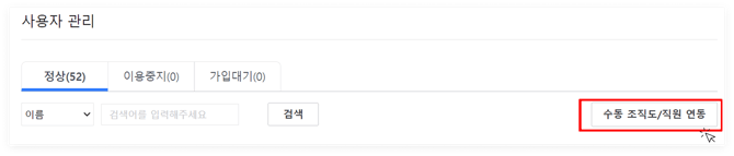 - 구성원 관리 화면 우측의 '수동 조직도/직원 연동'을 선택합니다.