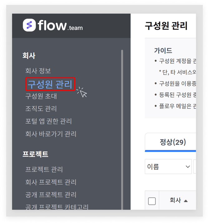- 어드민 메뉴 좌측 에서 '구성원 관리'를 선택합니다.