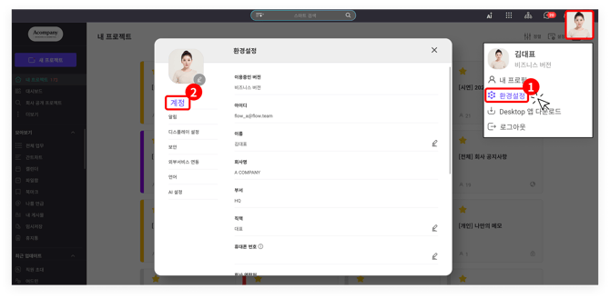 플로우 메인 화면 오른쪽 상단의 '프로필' 이미지를 눌러 '환경설정'을 클릭하면 환경설정 팝업이 실행됩니다. 계정 정보(이름/연락처/부서 정보 등)은 계정 설정에서 변경할 수 있습니다. 각 항목 오른쪽의 '수정' 아이콘을 클릭하면 수정할 수 있습니다.