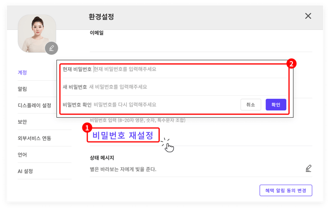 메뉴 내 비밀번호 카테고리에서 '비밀번호 재설정'을 누르면 비밀번호를 변경할 수 있습니다(①). 현재 비밀번호를 확인하는 절차 이후에 새로운 비밀번호로 변경할 수 있으며, 비밀번호는 영문과 숫자, 특수문자를 포함해 8~20자 내로 설정 가능합니다(②).