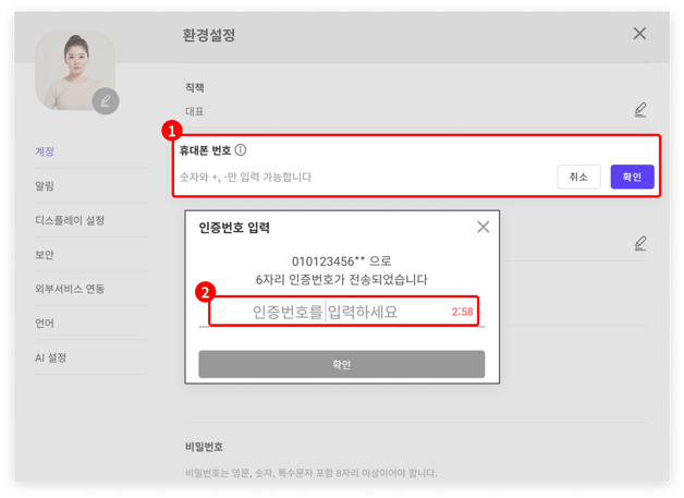 휴대폰 번호 수정 시에는 입력한 번호로 인증번호 문자가 발송됩니다. 인증 절차 이후에 수정을 완료할 수 있습니다.
