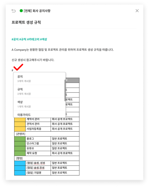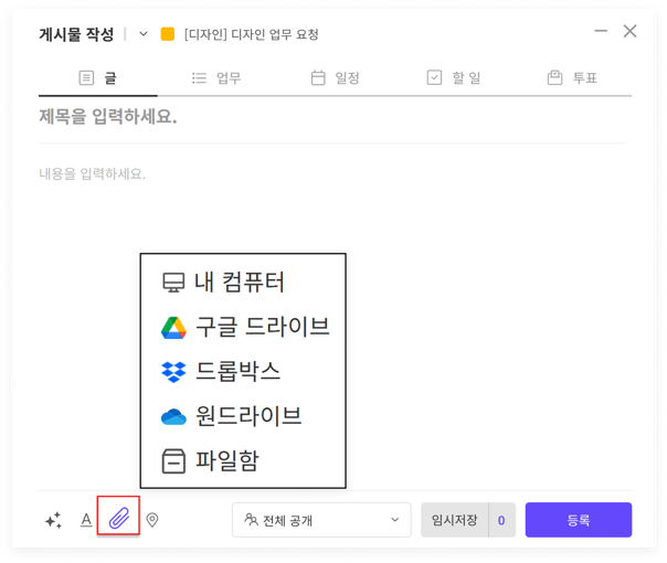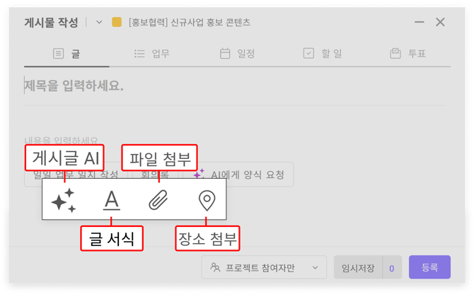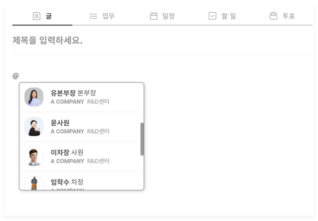 글 게시물은 일반적인 텍스트를 입력하고 이미지나 파일을 공유할 수 있습니다. 팀원들에게 정보를 공유하거나 공지할 때 활용할 수 있는 기능입니다.