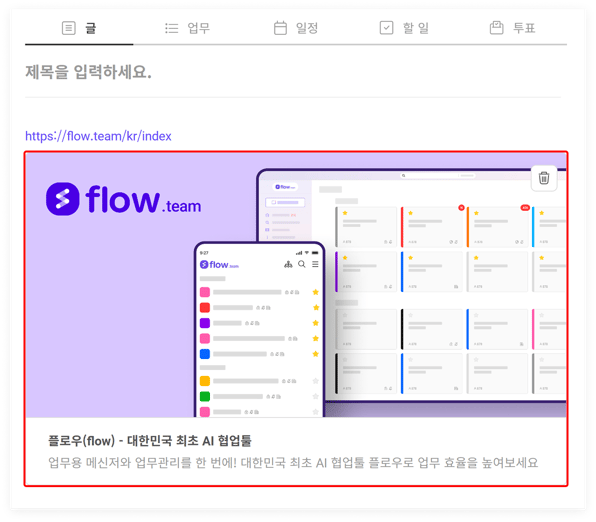 링크를 입력하면 하단에 링크 미리보기가 생성됩니다. 미리보기 위치는 드래그하여 변경할 수 있습니다. 링크 미리보기의 우측 상단에 휴지통 아이콘을 클릭하여, 미리보기를 삭제할 수 있습니다.