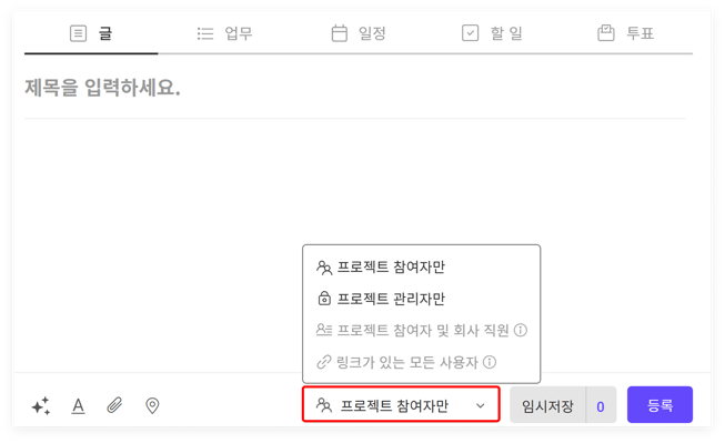 게시물 공개 범위를 '전체 공개' 또는 '프로젝트 관리자만' 등 상황에 맞게 설정할 수 있습니다. 필요하다면'외부 공개' 형태로도 적용이 가능합니다.
