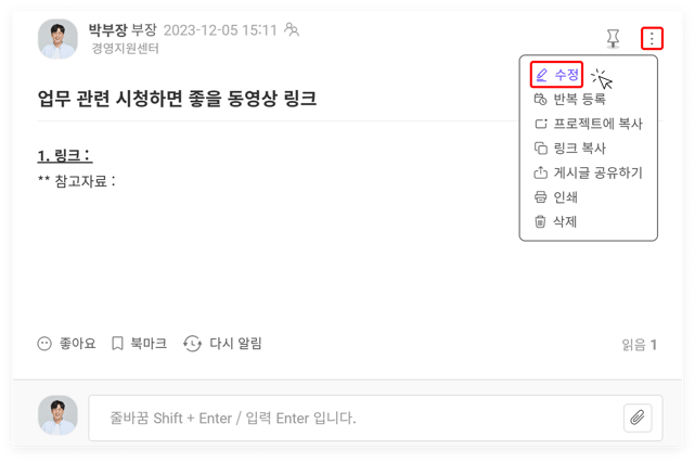 작성된 게시글 우측 상단의 더보기에서 등록한 글을 수정할 수 있습니다. 우측 상단의 '더보기 > 수정' 선택 시 작성된 글을 수정할 수 있습니다.