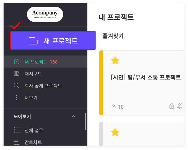생성과 동시에 우리 회사 직원 모두가 자동 참여되는 프로젝트로, 임의로 사용자를 내보내거나 외부 직원을 초대할 수 없습니다. 이러한 특징으로 기업 관리자만 만들 수 있고, 직원이 새로 추가되는 경우 이미 생성되어 있는 회사 프로젝트에 자동으로 참여됩니다. (회사 프로젝트 만드는 법 바로 가기)