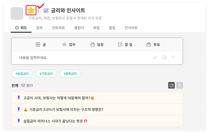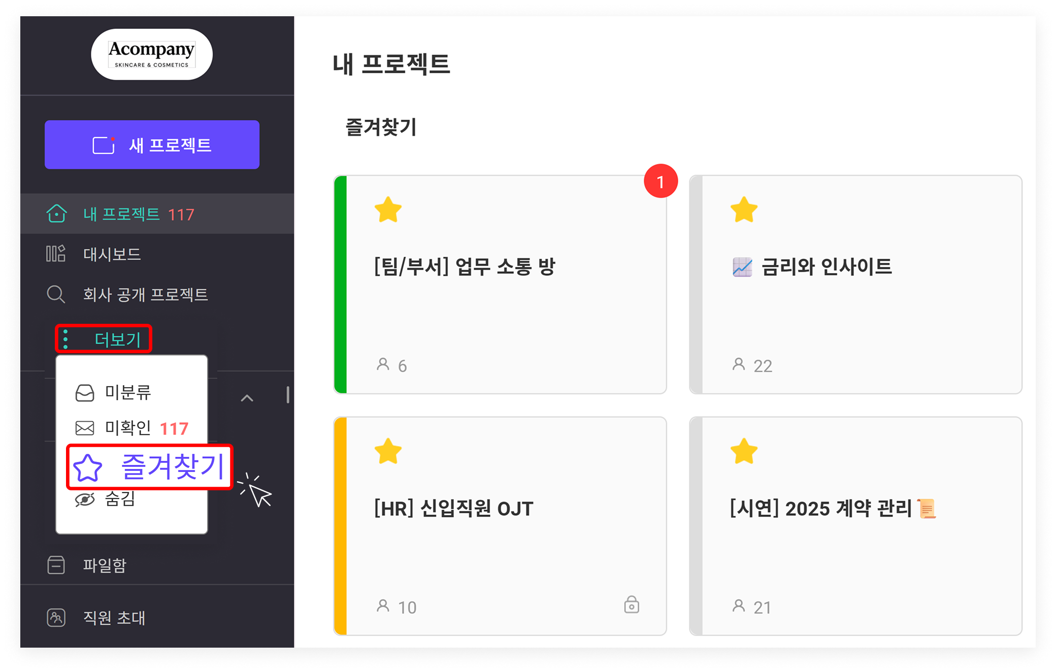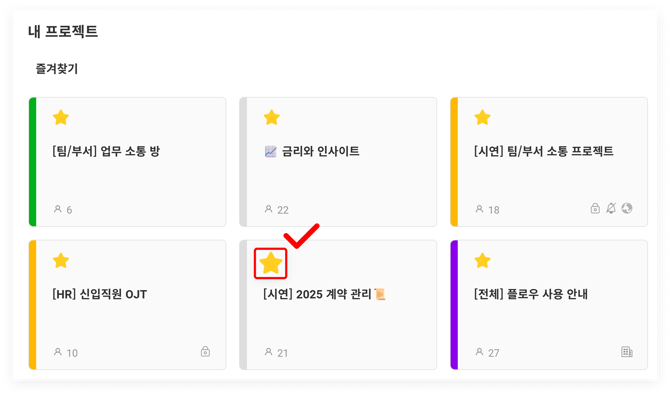 사람들과 자주 소통하거나 메모 용도로 많이 드나드는 프로젝트가 있다면, 즐겨찾기 설정을 통해 상단에 고정하거나 따로 모아서 확인할 수 있습니다.