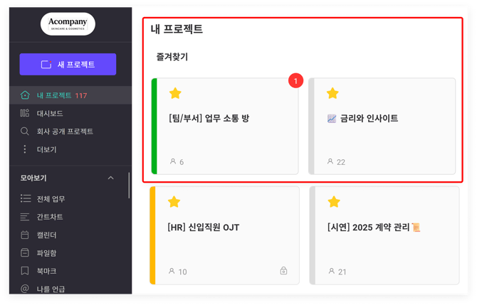 '즐겨찾기' 지정된 프로젝트들은 메인 화면 상단에 고정되어 모아볼 수 있습니다.