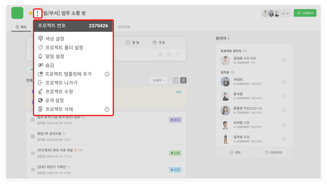 '프로젝트 수정'과 '프로젝트 삭제'는 프로젝트 관리자에게만 보이는 항목입니다.