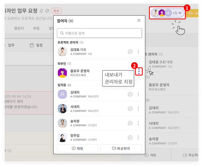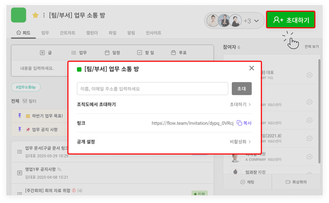 프로젝트에서 함께 업무를 공유하거나 소통할 직원 또는 외부 협력사 직원을 초대할 수 있습니다. (참여자 초대 방법 자세히 보기)